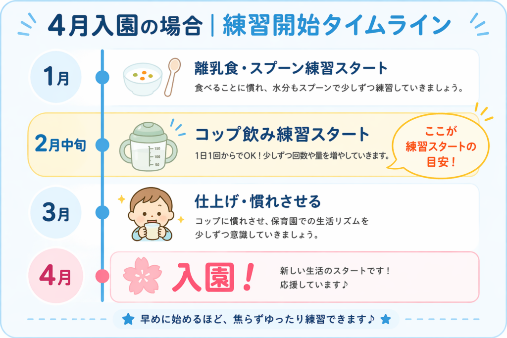 私は3月の入園前個人面談で、保育園では飲まない子もいると聞いて焦りました。そこからコップのみの練習を始めましたが、4月中には完全にできるようにならず、育休延長に至りました。