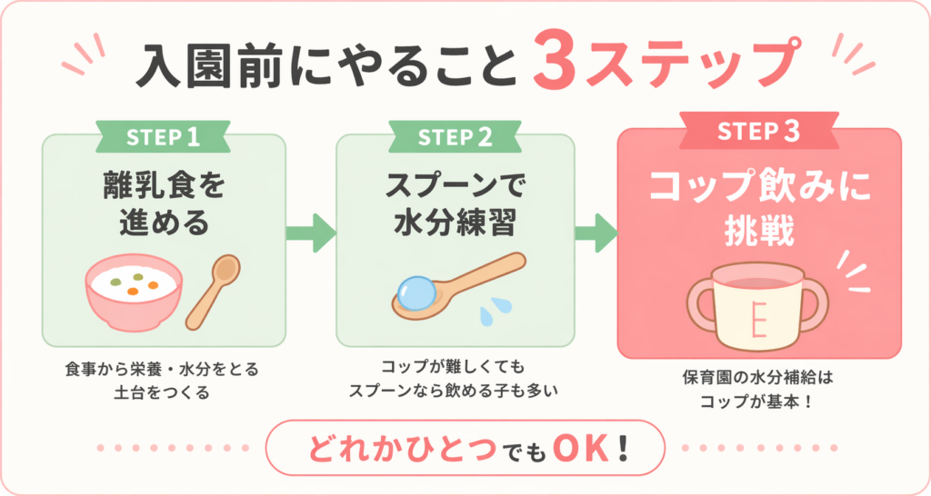 どれか1つでもできると、哺乳瓶練習がうまくいかなくても「水分が取れない問題」はほぼ回避できます。