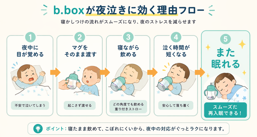 👉 夜中に起きたとき「すぐ飲めて、こぼれない」「傾けても大丈夫」なことが起こさないカギだからです。