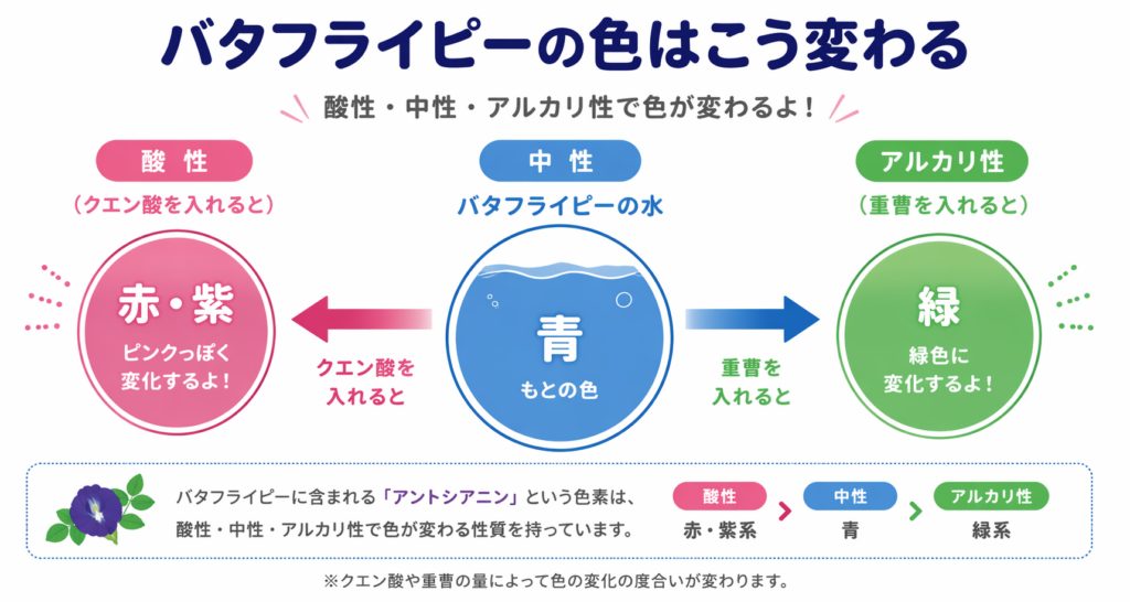 - 青 → 紫 → ピンク(クエン酸)
